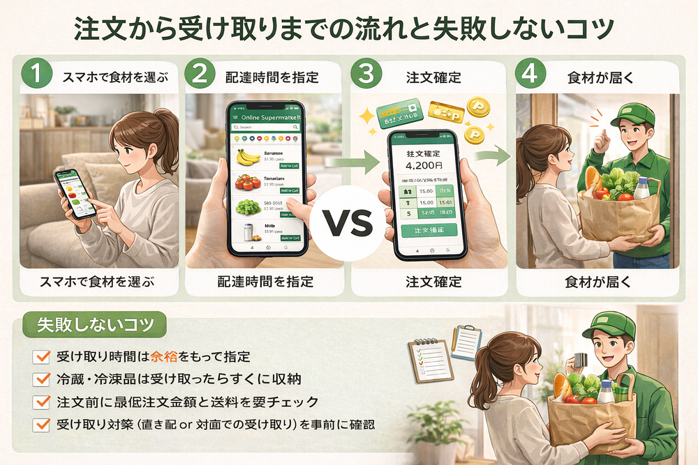 一連の流れを体験すると、操作そのものよりも「事前に少し準備すること」が重要だと感じる人が多いようです。配送枠の確認、代替品設定、受け取り方法の選択――これらを把握しておくだけで、利用時の不安はかなり軽減されます。ネットスーパーは慣れるほど手際よく使えるようになり、買い物の段取りそのものが整っていきます。最初の一歩さえ踏み出せば、あとは日常の中に自然に組み込まれていくでしょう。